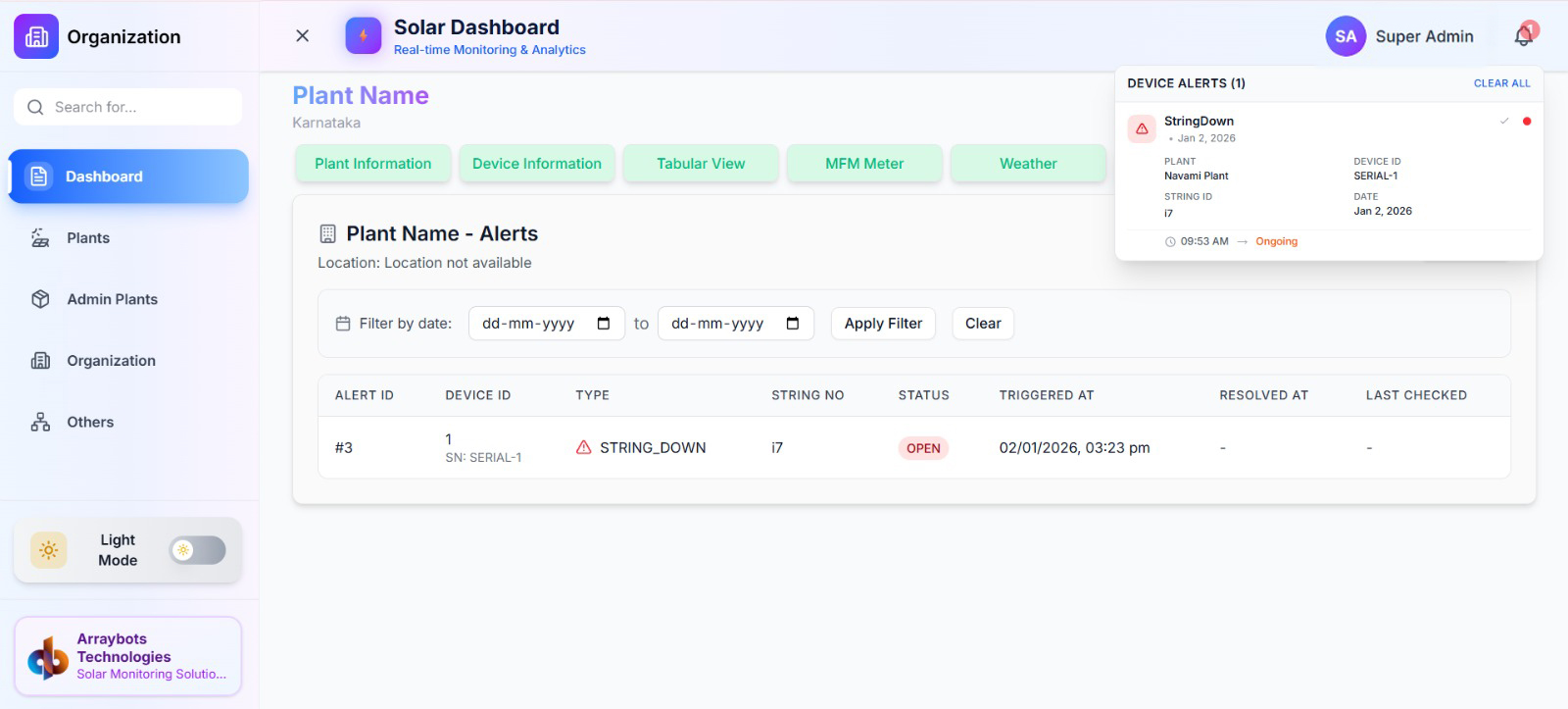 Instant alerts for faults and under-generation — with full resolution history tracking.