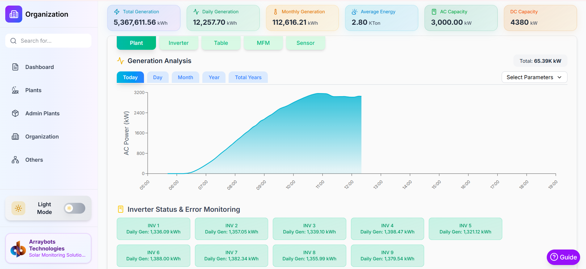 Deep-dive into individual inverter performance with granular tabular and graphical views.