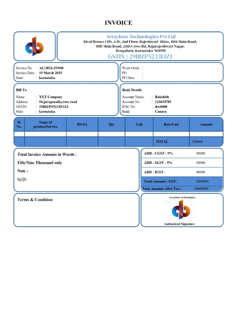 Arraybots provides a streamlined invoice creation system tailored specifically for Manpower. Each invoice is manually generated based on client-specific data, ensuring accuracy, clarity, and compliance with GST standards.