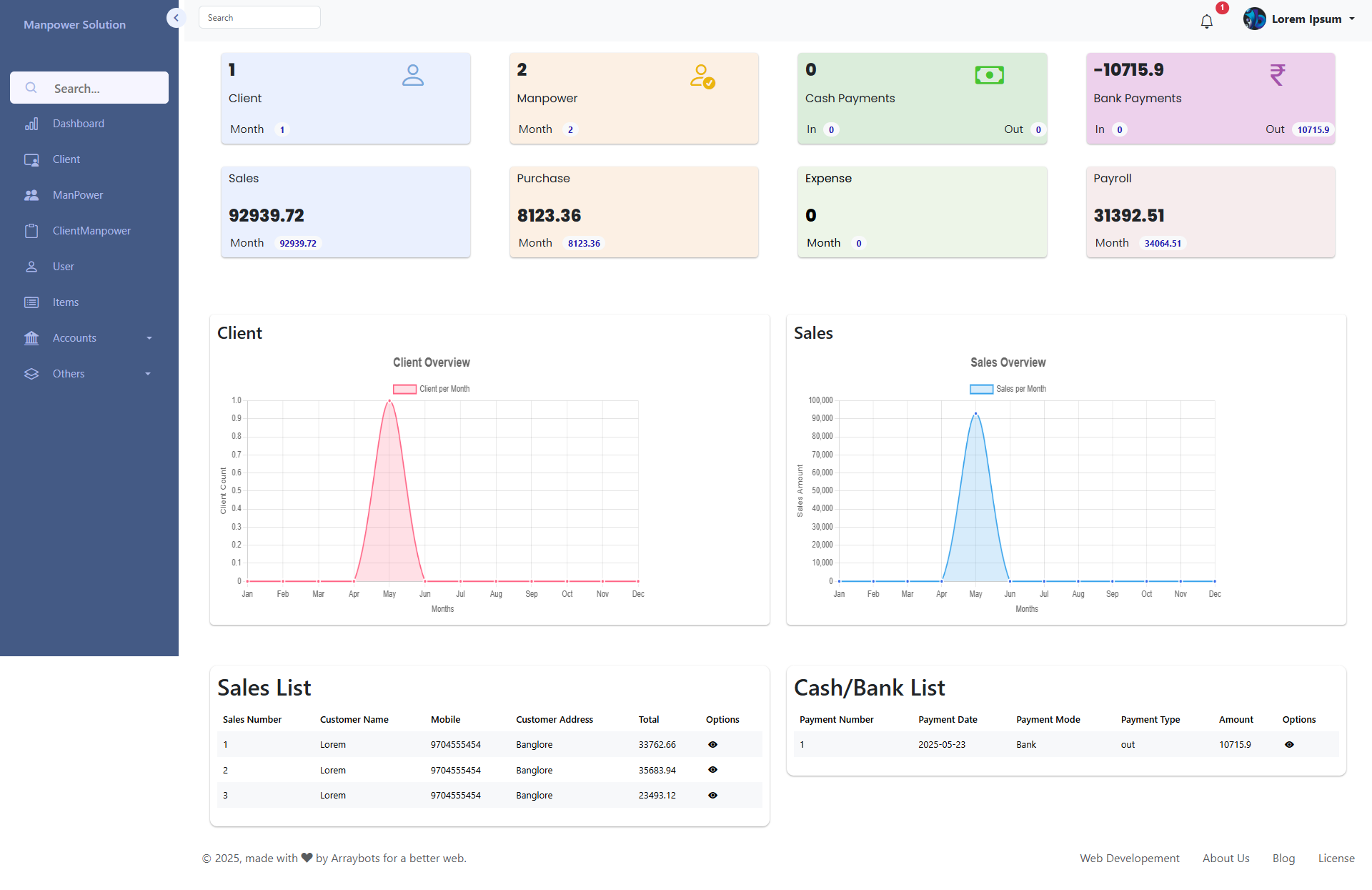Overview: The Manpower Solution Application is a smart platform for managing workforce sourcing, tracking, and payroll across industries like IT, education, and facility services.